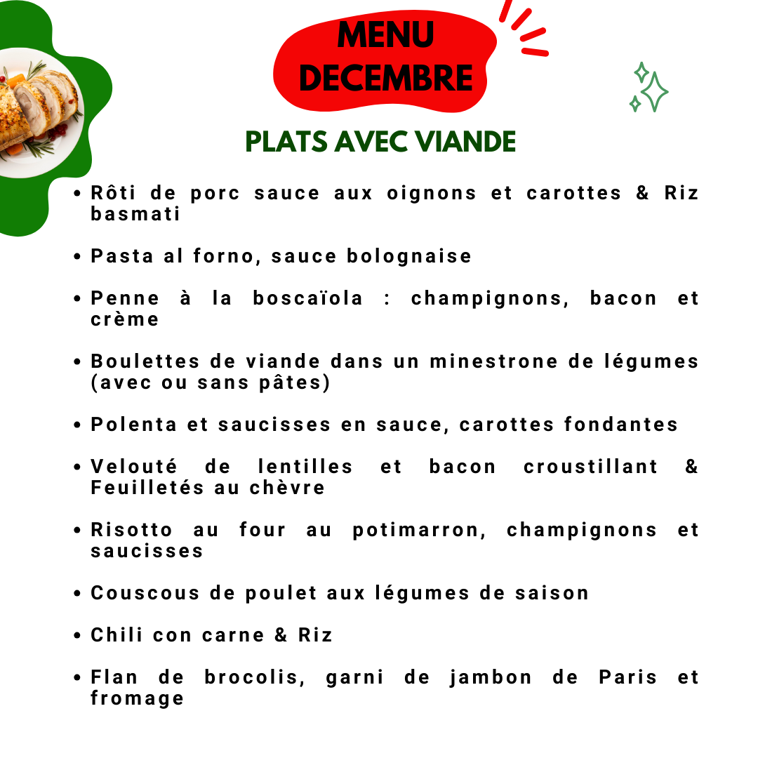 Découvrez vite le menu du mois de Decembre! Cliquer sur les images pour agrandir et voir les différents plats